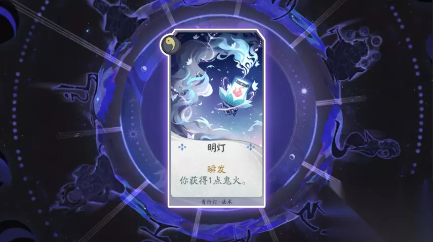 卡牌名称:明灯 卡牌等级:一级(法术牌) 卡牌效果:瞬发 你获得1点鬼火 卡牌作用:可以通过基础能力获取的卡牌,在使用了瞬发卡牌效果的条件下可以获得额外一点鬼火,因为能通过基础能力获取,可以选择不带。