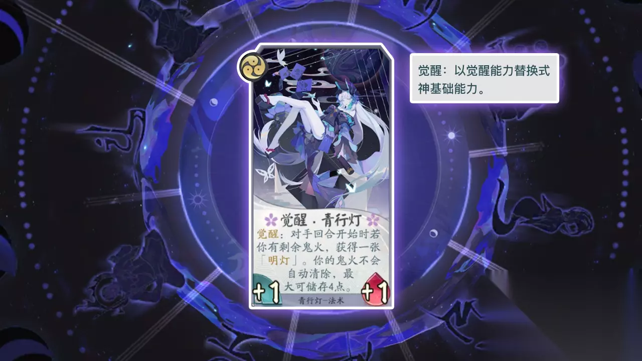 卡牌名称:觉醒·青行灯 卡牌等级:三级(法术牌) 卡牌效果:对手回合开始时若你有剩余鬼火,获得一张“明灯”。你的鬼火不会自动清除,最大可存储4点。 卡牌作用:青行灯的觉醒卡牌,可以积攒本回合未使用的鬼火,最多可以存储4点鬼火,意味着后期我们的输出式神只要手牌足够,就可以在一回合内给敌方造成致命的打击。