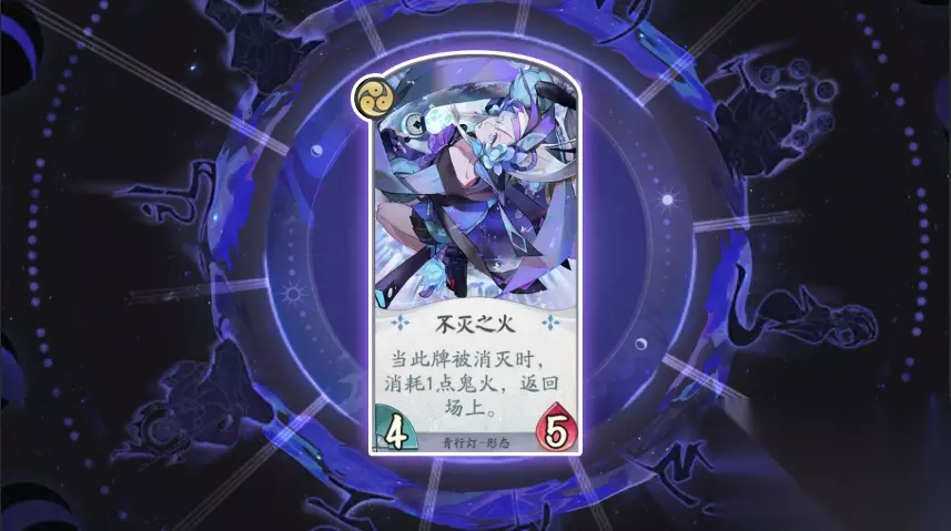 卡牌名称:不灭之火 卡牌等级:三级(法术牌) 卡牌效果:当此派被消灭时,消耗一点鬼火,返回场上。 卡牌作用:气绝时消耗一点鬼火再次返回场上,需要注意的时青行灯返回时会复生在准备区,并不会返回战斗区。在对战中应当注意避免牌手因此被击败。