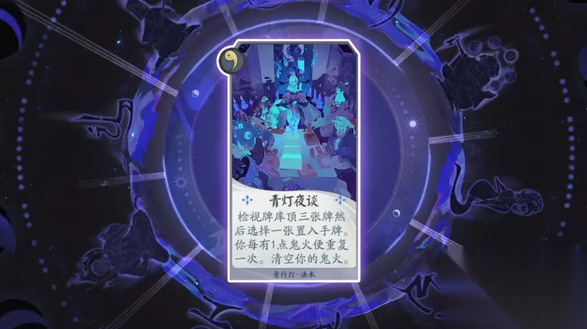 卡牌名称:青灯夜谈 卡牌等级:一级(法术牌) 卡牌效果:检视牌库顶三张牌然后选择一张置入手牌,你每有1点鬼火便重复一次。清空你的鬼火。 卡牌作用:检视牌库的效果是展示牌库顶的三张牌,然后你可以任选一张加入手牌。此效果使我们想要打出某些特定组合时,手牌选择变得可控了许多。减少高等级牌过多的卡手状况。而在后期叠加许多鬼火的情况下又能大量过牌。