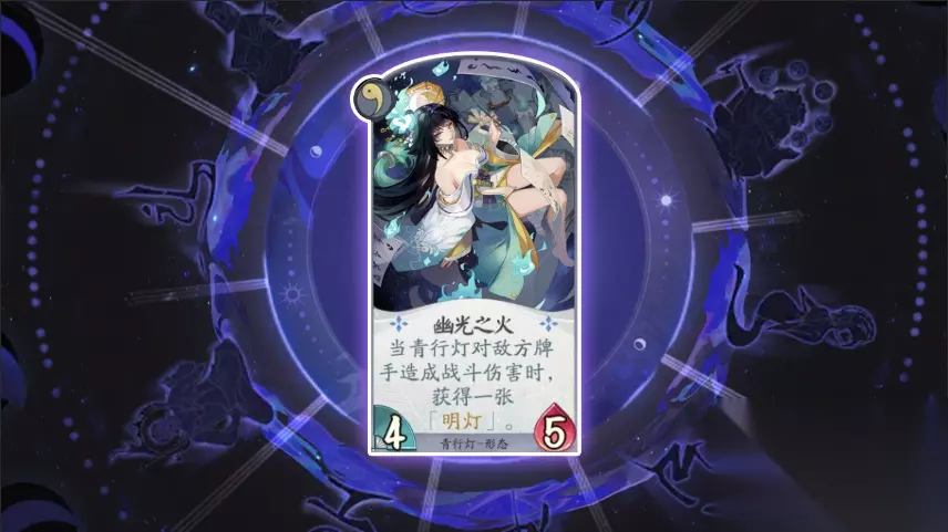 卡牌名称:幽光之火 卡牌等级:一级(形态牌) 卡牌效果:当青行灯对敌方牌手造成战斗伤害时,获得一张“明灯。” 卡牌作用:敌方战斗区没有式神阻挡时可以进攻敌方牌手来获取“明灯”,建议在前期使用,中后期有其他能力时作用不是很明显。