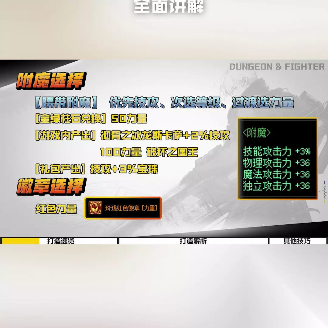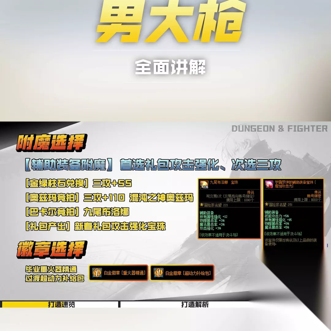 【戒指附魔】属性强化,对属性强度类型没有要求,所有部件统一【金绿柱石兑换】+25单属性强度,+23全属性强度, 【伊斯洛兑换】+30单强、+28满强、个性20、【游戏内输出】+35双属性强、+33宝物属性强、玉破坏女王、莫小行者、GB-1赫普斯解析、 GB-Dilligon 和不稳定组接缝创建: 黄色力量/黄色攻击速度,构建分析:【游戏内输出】+35双属性力量。 +33全属性强,红色力量,通关分析:【辅助装备附魔】首选礼包攻击强化,第二选第三攻击,【金绿柱石兑换】第三攻击+55,【奥兹玛射击】第三攻击+110混沌奥兹玛之神,【巴卡尔意外出手】九尾布罗娜,【礼包输出】新年礼包攻击强化宝珠,毕业重枪械熟练度,超强移动补给包。 【魔石结界】,属性强化:【黄金绿柱石兑换】+20全属性强,【游戏内输出】+30全属性强毁灭龙林斯+25全属性强毁灭预兆贝利亚斯,【岛屿兑换】+30全属性强,【奥兹玛居然出手】+30 全属性强奥兹玛,舞动仇恨的混沌邪神。 构建分析: 【耳环附魔】巴卡武强,次选巴卡尼强。 【游戏内输出】四维+150、纯血天神黑眼夏琴沃斯、【机械兑换崛起】四维+5、属性+11机桃美琪耳环珠、【巴卡尔实拍】斯唐+7太阳,属性强度+15图一炮,四次元+50,属性强度+11魔龙宁帕,基地里没有徽章,那我们看看加点,再看看装备搭配。