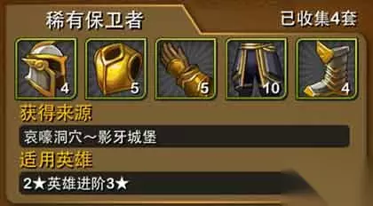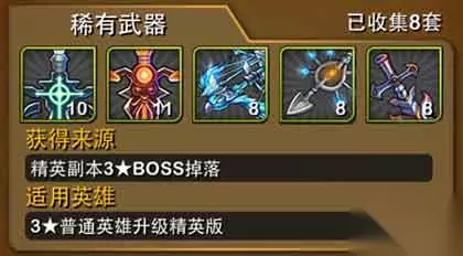 稀有武器 此套装备是3星英雄升级3星精英(俗称金边)是套装,这套装备在精英副本3掉落。3星精英的英雄感觉升级必要性不高,建议玩家直奔4星蓝卡进化比较好。