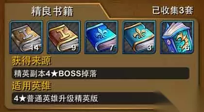 精良书籍 英雄进入中期后,升级都会减缓而且没有4星进化5星的套装,所以这套书籍装备就非常好用了。如4星劣人升满60级后,要往后刷副本难度会比较大,建议收集此套要提升英雄的所有属性技能。