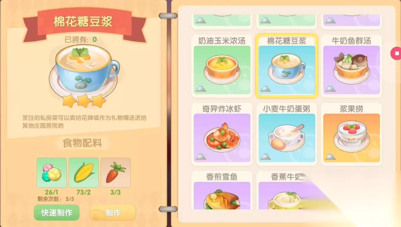 摩尔庄园棉花糖豆浆怎么做呢?这其实是一道全新的食谱,将棉花糖与豆奶完美的结合,让你感受到了一种极致的味道,那么摩尔庄园游戏中如何制作这款美食呢?以下编辑为您提供制作方法,一同来看一看吧。 摩尔庄园棉花糖豆浆怎么做 食谱配方:棉花糖*1、玉米*2、胡萝卜*3 稀有度:2星