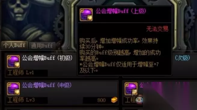 《dnf》2023增幅技巧攻略 强大的工会:工会不仅可以买到药剂,还可以买到 BUFF,如果工会的人想要提升工程师的等级,就可以买到 BUFF,最高的 BUFF可以增加百分之五的提升几率。 虽然这玩意只对7级以下的装备有用,但如果给队友们强化的话,那就相当于给自己的材料加了一次,那就能省下一大笔钱。