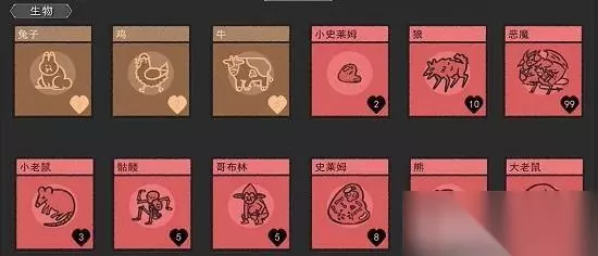 2、生物 包含:狗、兔子、鸡、牛、小史莱姆、狼、恶魔、小老鼠、骷髅、哥布林、史莱姆、熊、大老鼠等,合成方法查看上放表格。