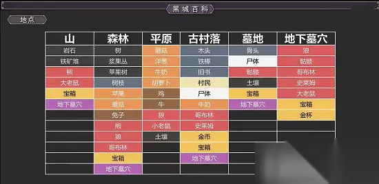 2、地点 山、森林、平原、古村落、墓地、地下墓六等六个地区,都有不同的材料与物资,通过下图前往指定地点收集即可。