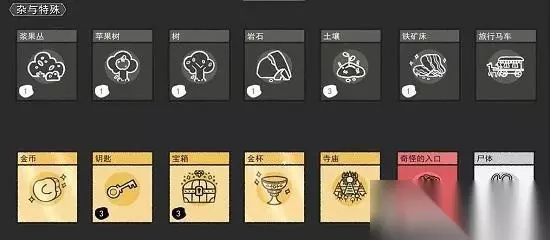 6、杂与特殊 包含:浆果树、苹果树、树、岩石、土壤、铁矿床、旅行马车、金币、钥匙、宝箱、金杯、寺庙、奇怪入口、尸体等,上方提供合成方法。