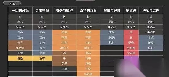 五、合成总表 1、卡包出发表 每种卡包包含材料都不同,玩家在合成时查看下方图表合成。
