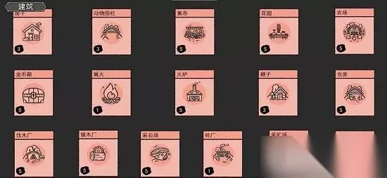 4、建筑 包含:房子、花园、集市、金币箱、篝火、棚子、仓库、农场、采石场、砖厂、伐木场、采矿场、冶炼厂等,合成方法查看上方表格。