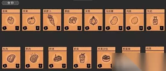 3、食物 包含:浆果、苹果、胡萝卜、蘑菇、洋葱、马铃薯、鸡蛋、牛奶、熟肉、生肉、煎饼、奶昔、水果沙拉、煎蛋卷、炖菜等,合成表格上方已提供。