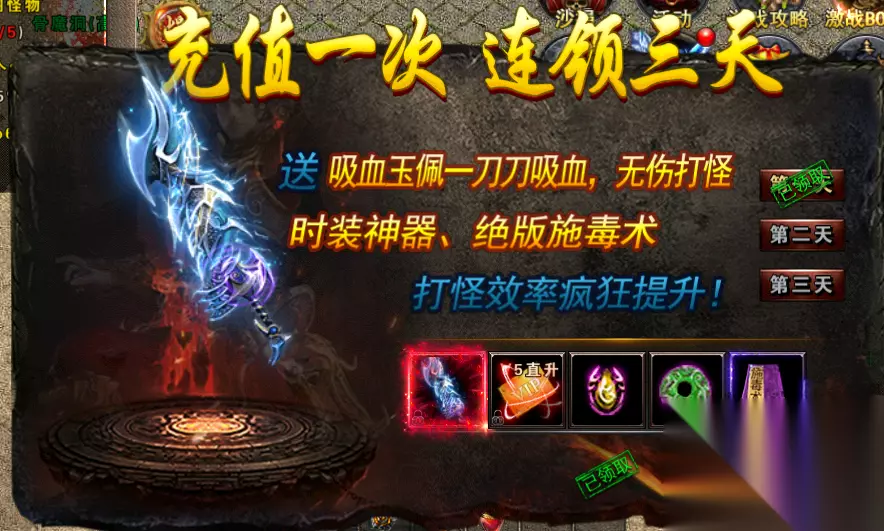 5. 首充礼包 首先不得不说的就是游戏里的首充礼包,充值一次可以连领3天奖励,第一天送吸血玉佩,无伤打怪时装神奇,绝版施毒术。还有VIP直升5级卡,打怪效率疯狂提升。第二第三天送顶级剑法。克服手短,PK必备。砍怪如切菜,刷怪必备。使你领先其他新手玩家。