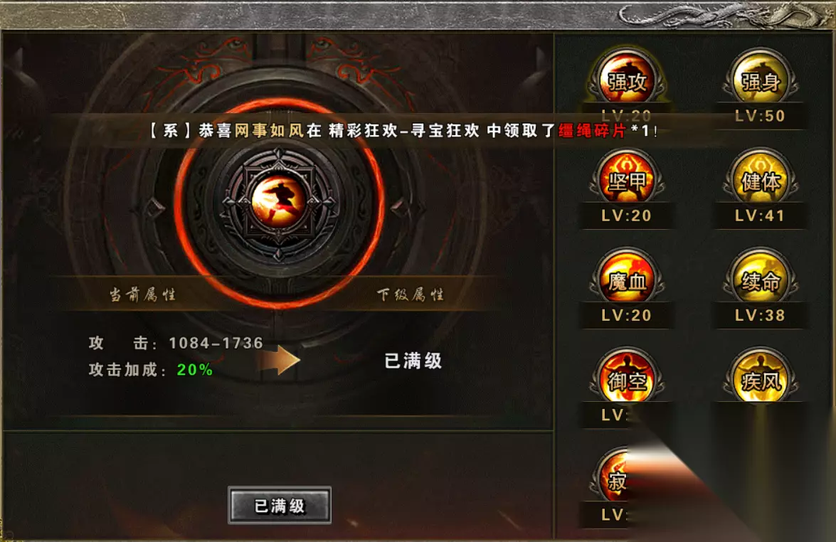 7. 神炉系统 玩家可以通过击杀BOSS,活动,商城购买获得血符,玄甲,魂珠,龙戒结晶。对神炉进行升阶,可以增加玩家的生命,攻击,防御。暴击。使你在怪物攻城跨服战场等活动中有更好的游戏体验,享受砍瓜切菜的乐趣。