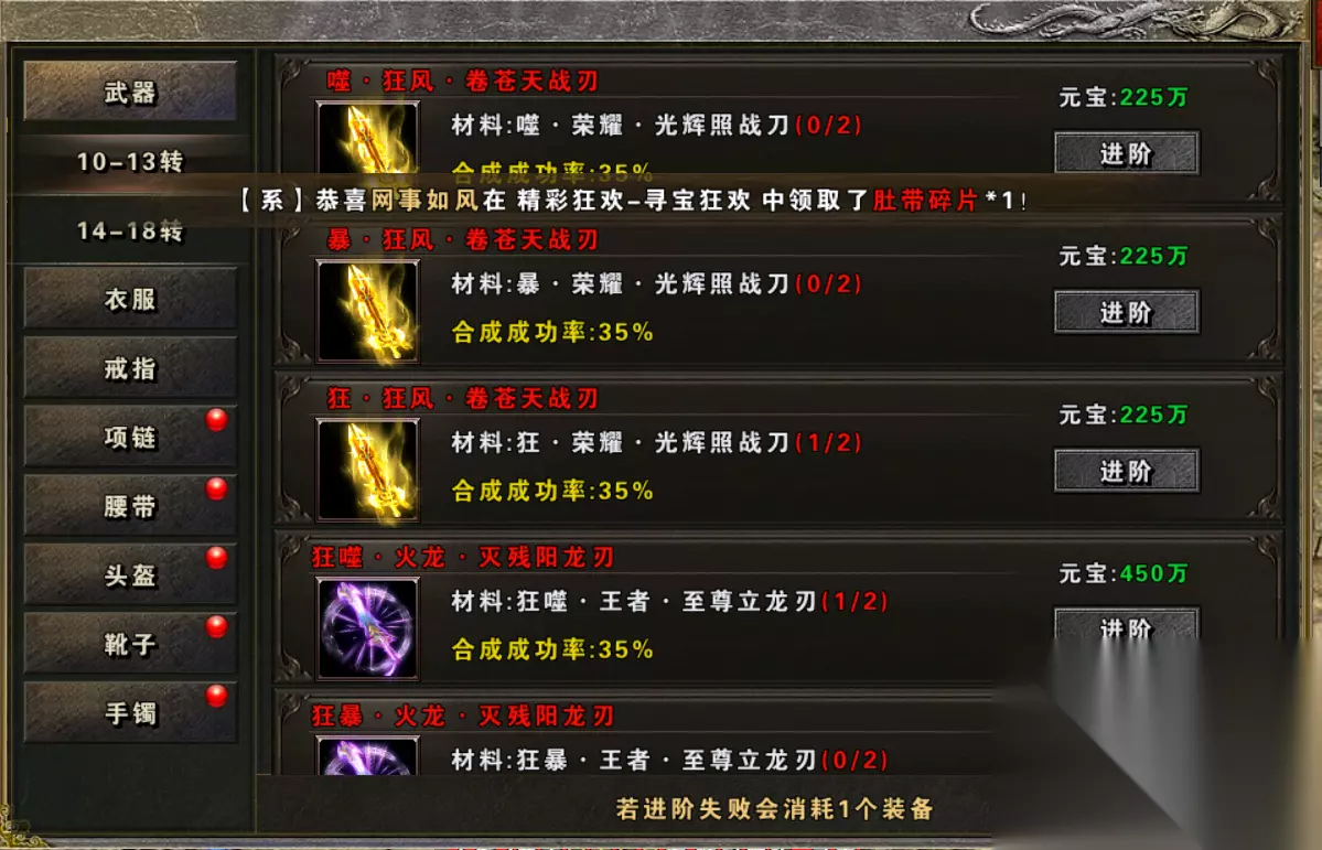 3. 装备 多出来的高阶装备不要急着回收,熔炼可产出稀有材料,熔炼的装备等级越高,获得的材料也越多。高阶装备可融合可进阶。可以在盟重城进行融合进阶。这些都是可以提升实力的小技巧。装备起来后在怪物攻城,血战沙城,跨服远征中游刃有余。