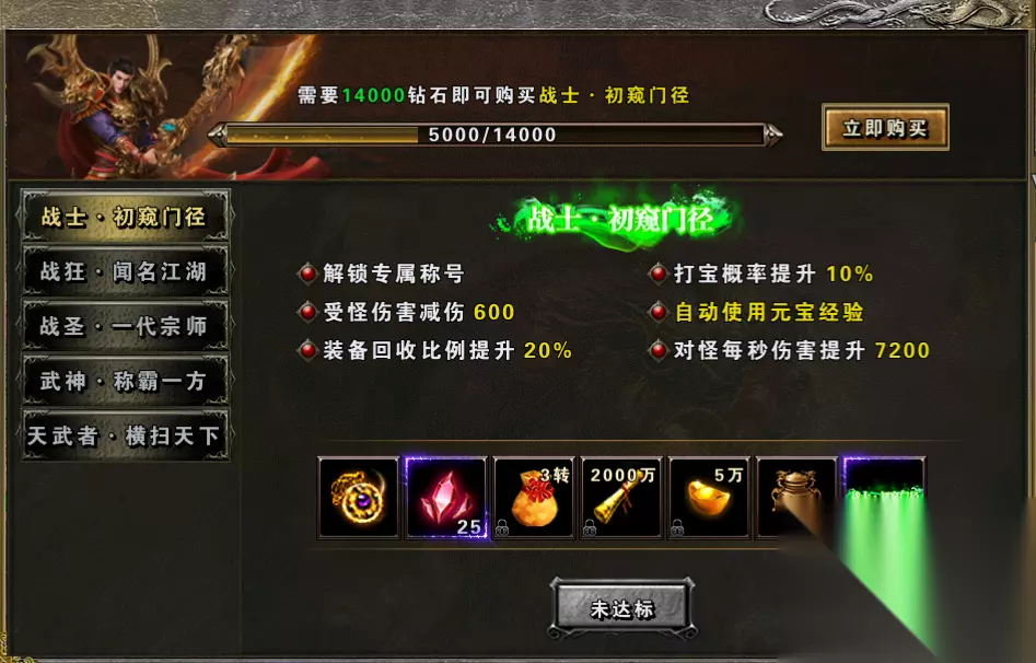 6. 特权 购买特权后,可以大大提升打宝概率。自动使用元宝经验。装备回收比例提升。还能在击杀怪物时增加伤害,减少所受伤害。让你有实力去挑战BOSS之家中的高难度BOSS,爆出更多的极品装备和道具,可以根据自身实际情况购买特权等级。
