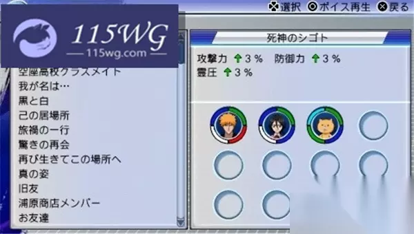 组合:黑崎一护、朽木露琪亚(义骸)、魂(玩偶) 效果:攻击力、防御力、灵压上升3% 这组组合增益效果较为基础,但能为角色提供一定的全方位提升,特别适用于基础属性的增强。 002