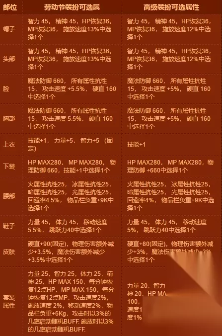 “天使与恶魔”装扮部分可选属性 帽子可选:释放速度+13%头部可选:释放速度+13%脸部可选:攻击速度+5.5% 胸部可选:攻击速度+5.5%上衣固定:力量5,智力5下装可选:技能+1 腰部可选:回避率+4.5%鞋可选:移动速度+5.5%皮肤可选:硬直+90