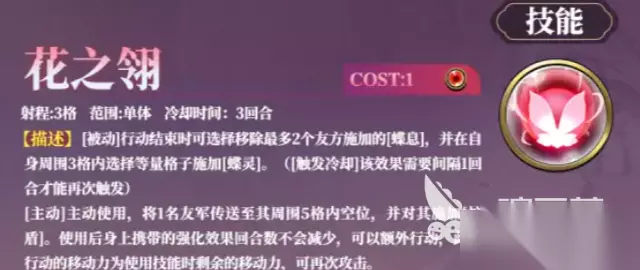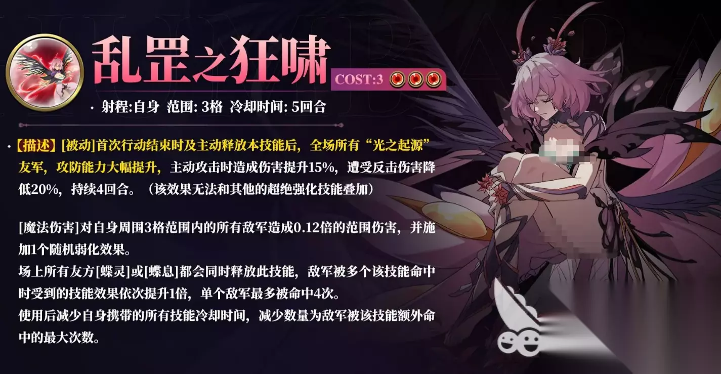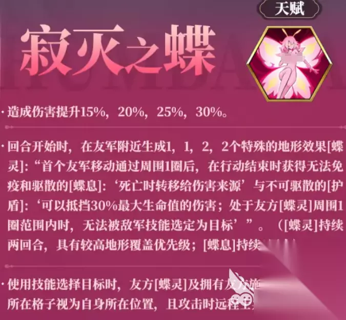 她的天赋“寂灭之蝶”首先就给她带来了非常可观的伤害加成。简单来说,每一回合开始时,她会在友军周围创造一个特殊的地形效果——“蝶灵”。这玩意儿不仅看起来有点浪漫,而且实用得不得了。只要你的小伙伴在这个“蝶灵”范围内活动,首先会获得不可免疫、不可驱散的“蝶息”效果,这个效果简直是让敌人头疼不已。最可怕的是,敌方一旦攻击到你的友军,死亡时的伤害就会转移给攻击源!再加上防御性的“护盾”,能抵挡掉30%的最大生命伤害,这个时候敌人想要打破你的阵型,几乎不可能。