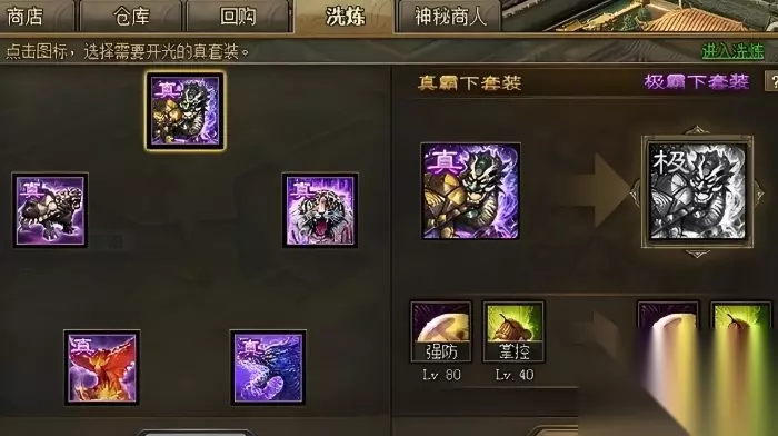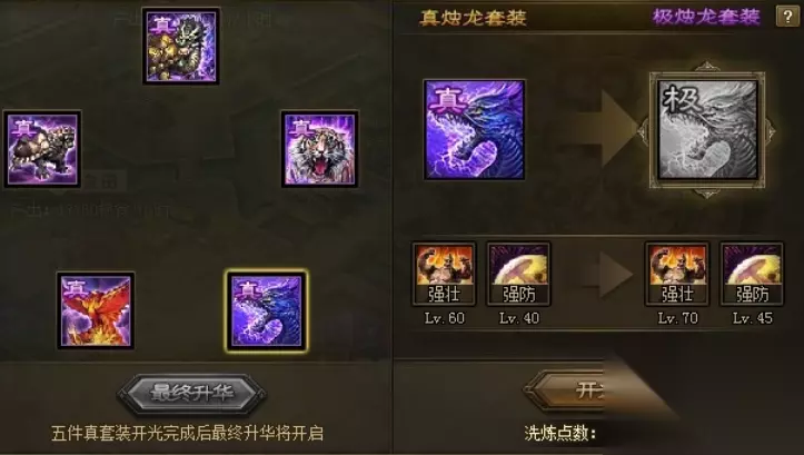 合成极套装的核心路径,是将已经拥有的真套装通过开光操作进行升级。当你集齐了全套真套装后,游戏通常会自动引导或弹出动画,提示你可以进入开光界面。开光在洗练界面中进行,每件真套装装备开光都需要消耗固定的1000点洗练点数,开光成功后,该装备就会转变为属性更强的极套装。这个过程是战力跃升的关键,因为极套装在属性上相比真套装有显著的提升,例如真烛龙开光为极烛龙后,其强壮属性等级会提升至LV.10,强防属性达到LV.5。