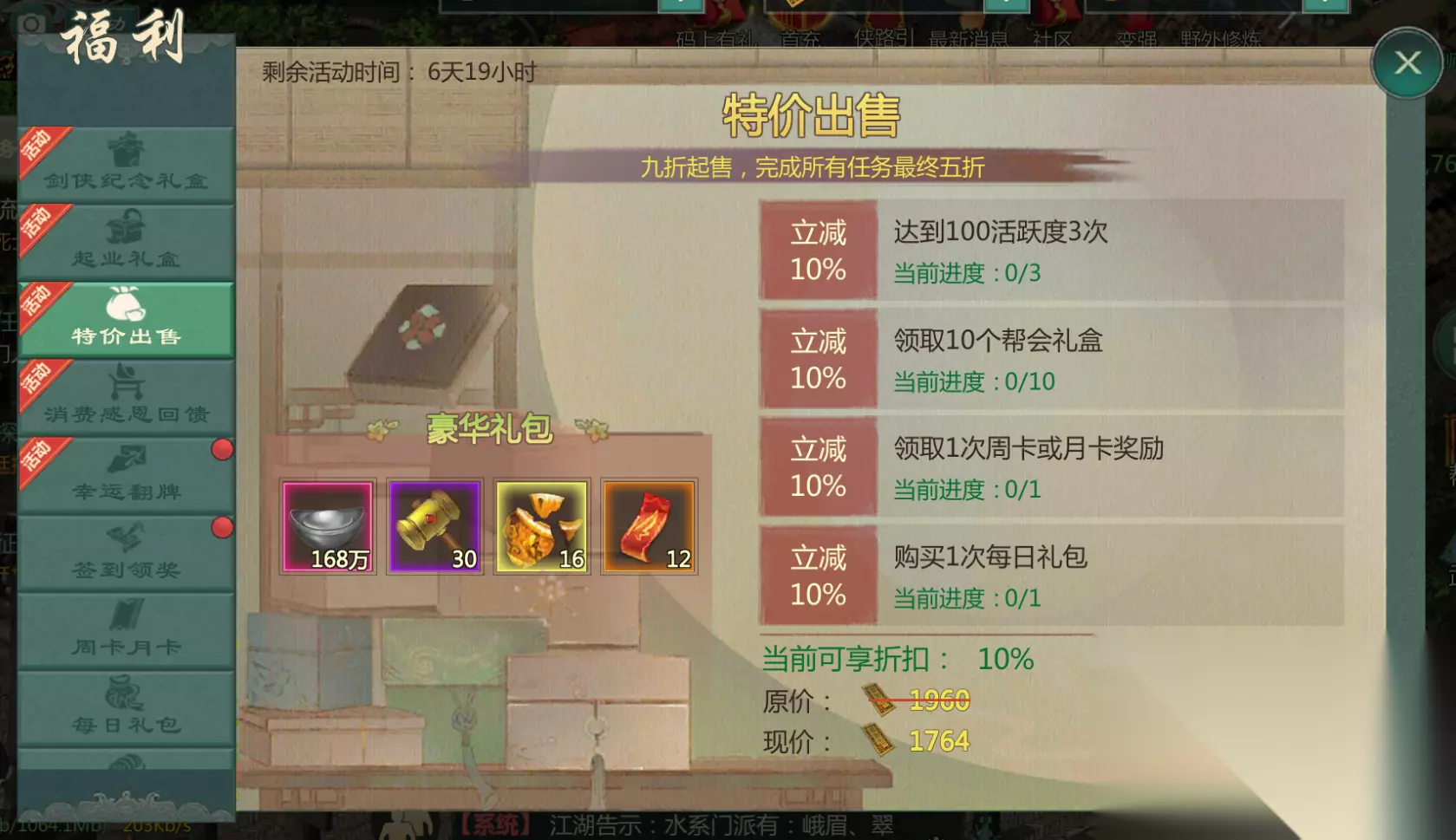 二、【特价出售】 活动时间:2月4日维护后~2月11日03:59; 活动范围:全区全服; 内含马具重随符、栖凤锤等稀有物品的豪华礼包将限时特价出售,活动期间,可享9折优惠,完成指定任务后最高可享5折优惠!活动期间每人限购1次。(根据服务器开放等级不同,特价道具不同,详见出售界面)