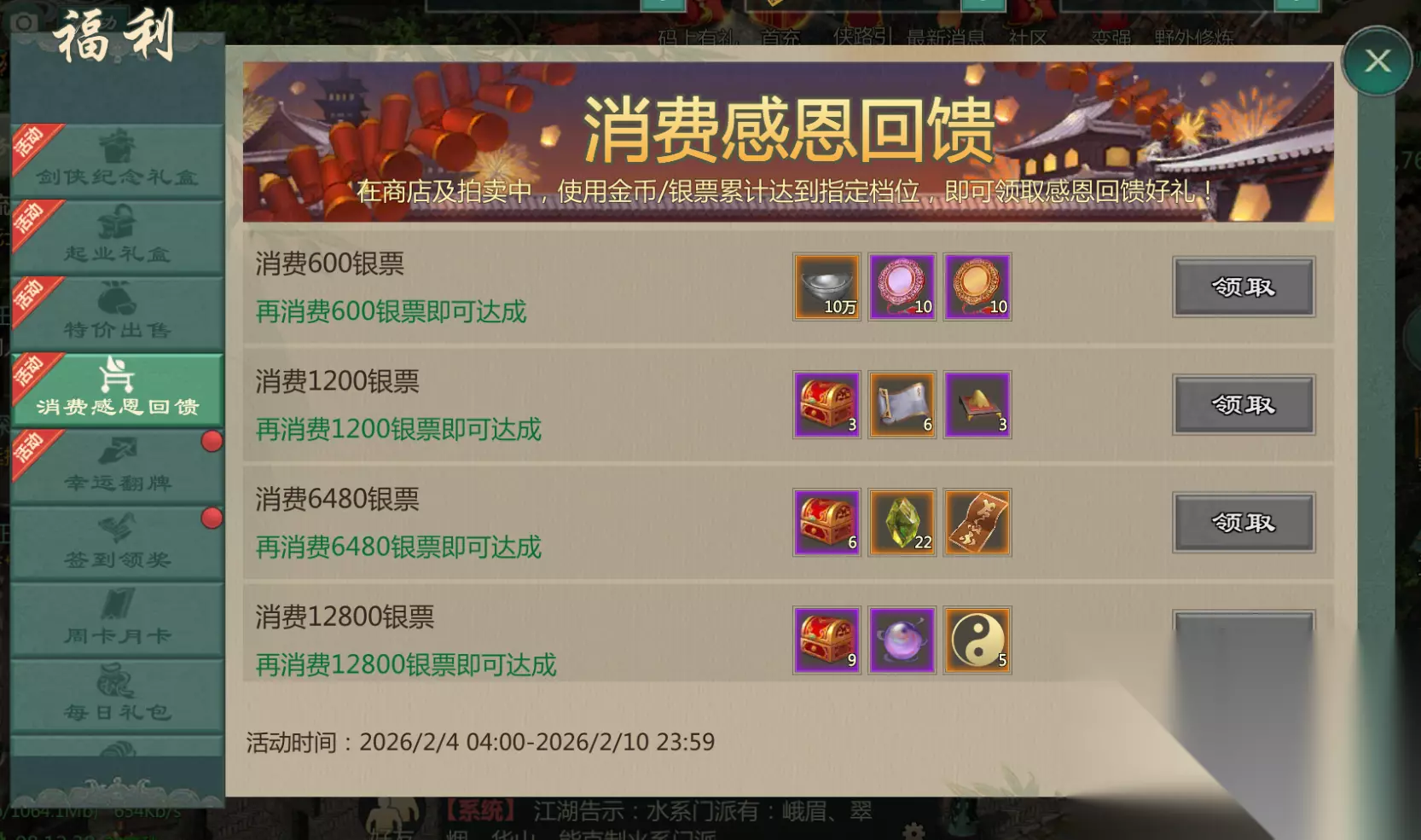 三、【消费返利】 活动时间:2月4日维护后~2月10日23:59; 活动范围:2月4日前开放的服务器; 活动期间内,在奇珍阁,限时商店,神秘商人,拍卖行,消费金币或银票达到一定数额的大侠可在福利界面内打开累计消费界面领取累计消费奖励。