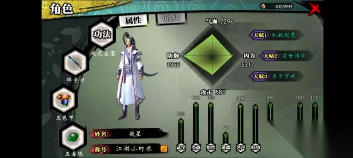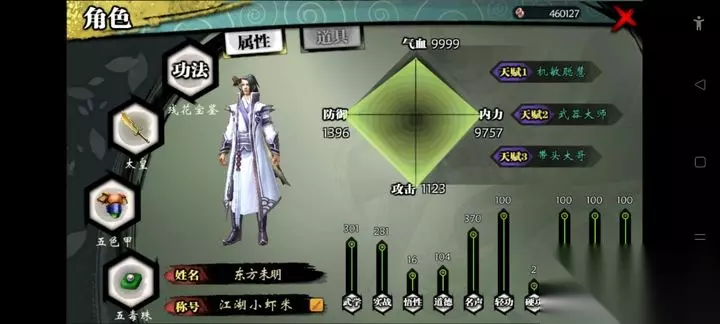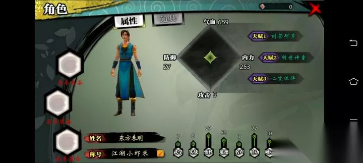 隐藏天赋的效果可是相当强力的,比如前世情缘能让所有角色好感获取翻倍,攻击加成上限高达100%,而老子有钱则可以根据身上的金钱数量提升伤害,最高能增加100%的攻击力。还有一些天赋比如元胎道体能每回合回复气血和内力,修炼徒手套路的速度也会翻倍,非常适合喜欢拳掌功夫的玩家。