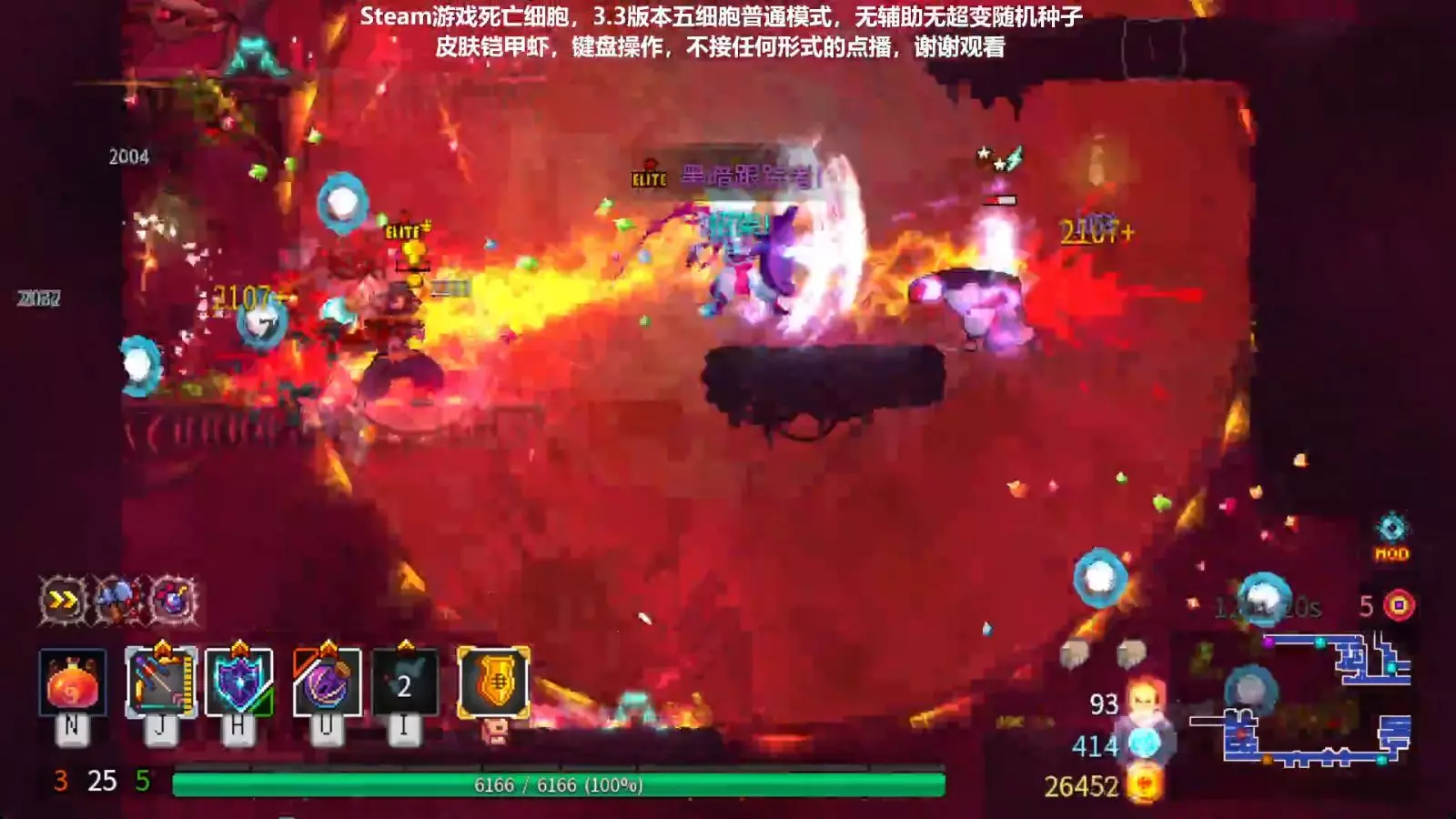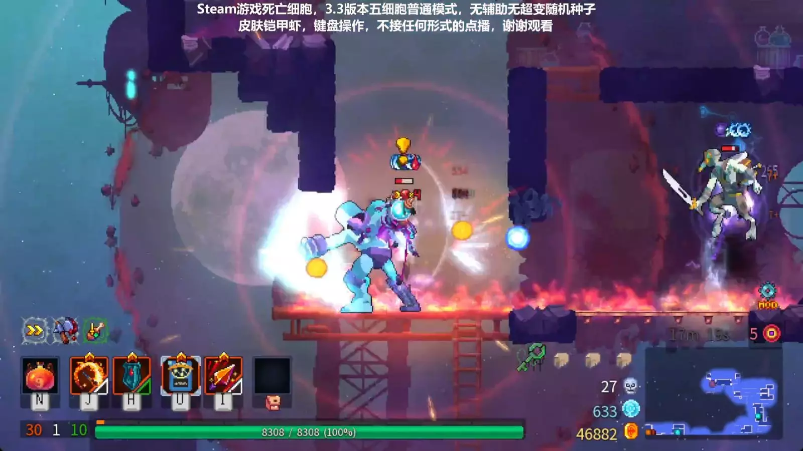 这是Steam平台《重生细胞》3.3版本的通关内容,玩家以键盘操作铠甲虾皮肤,无辅助无超变随机种子,完成五细胞普通模式15分钟无伤通关,展示了游戏中的关卡挑战与操作技巧。