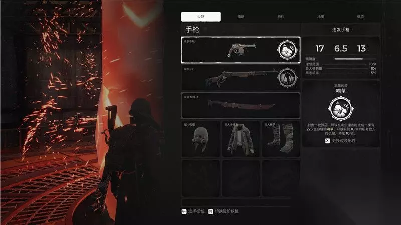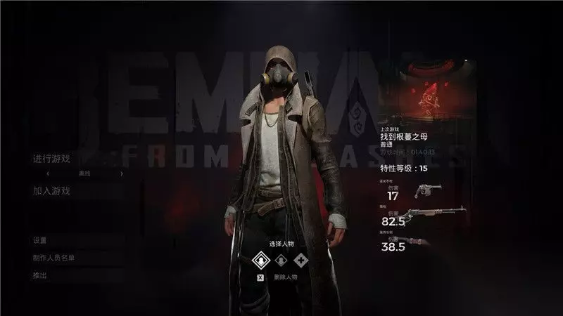 游戏中的暂停菜单: 1. 人物 人物栏显示了角色目前的武器和装备。 每种武器都有简单的几项属性,例如射程,弹匣量,伤害等。 装备则显示了目前装备所处的等级以及附属的效果器。