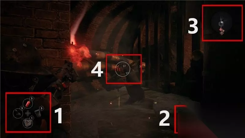 界面解析: 1. 快捷物品栏 你可以自定义4种快捷物品,方便在战斗时使用。 它们可以是解毒药,绷带,弹药箱,和其它辅助药品或道具等。 2. 武器栏与生命值 角色可以使用3种武器,一种近战武器,两种枪械武器。 枪械武器分为主枪和手枪,主枪一般受职业影响较大,伤害较高,但子弹较少。 手枪一般子弹较多,伤害一般。而近战武器是一般用来攻击猛扑上来的成群敌人。 3. 小地图 小地图的作用在游戏中并不大,但是地图上灰色的区域都是未探索的区域。 一般情况下,角色需要往“未探索区域”前进,很少走回头路或遇到类似迷宫类的情形。 4. 准星 所有远程武器都会有瞄准星,手枪和步枪的有效射程较远,因此会是个“十字瞄准星”。 霰弹枪的射程较近,准星一般为“圆圈瞄准星”。 一般情况下,角色在蹲下不动时的枪械准度是最高的。