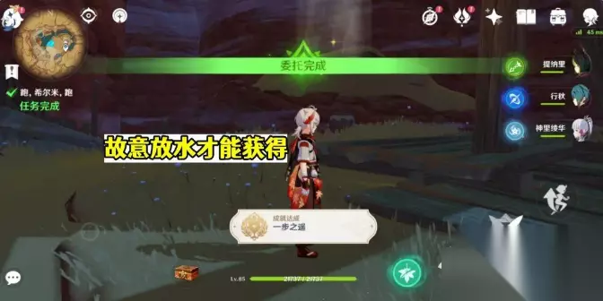也是璃月委托中的隐藏成就,委托名和成就名一样,拿到常九爷写的小说,在提交给NPC之前,好奇的小派蒙会跳出来,问我们要不要悄悄看一下?我们选择偷看,看完成就数+1。 11.一步之遥 须弥有个每日委托,是要我们与一个小孩赛跑,正常情况下随便虐他,但如果你放水输给了他的话,在委托做完之后,就能得到“一步之遥”成就。