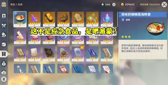 做这个成就的话,直接在【窃听风云】的节点开始即可。话说这个成就的名字,怎么感觉有点致敬那些不顾派蒙阻拦,非要跑到未开放区域的玩家,前面的区域,爷现在就要探索! 8.这不是应急食品 蒙德有一个给客人送餐的每日委托,名为【餐品订单】,对话领取到餐品后,我们直接打开背包吃了它,就可以获得该成就,吃了后会叫我们再去领一份,任务还能正常完成。话说这已经不是叛逆了吧?年轻人不讲道德。