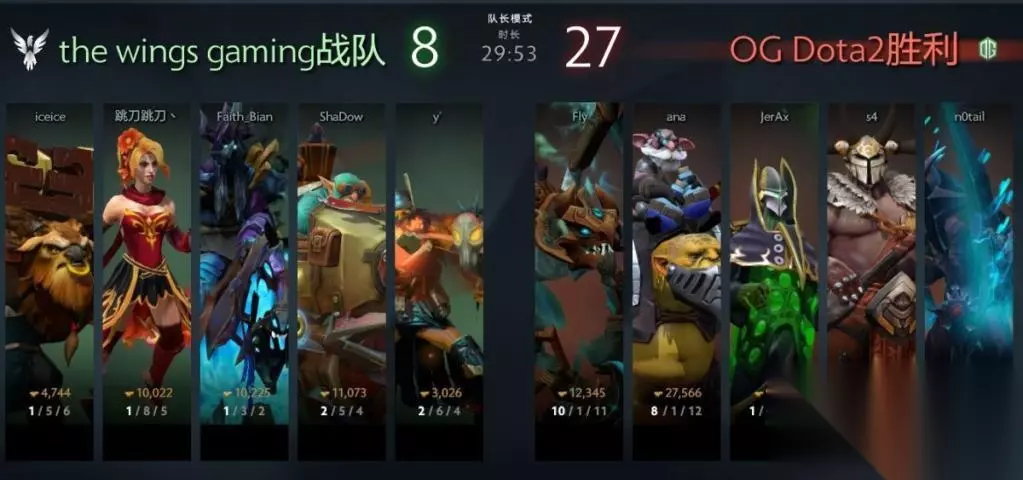 OG战队成员 游戏ID:N0tail-BigDaddy 姓名:Johan Sundstein 地区:丹麦 擅长英雄:死亡先知、上古巨神、莱恩 游戏ID:JerAx 地区:芬兰 擅长英雄:寒冬飞龙、上古巨神、神谕者 游戏ID:7ckingMad 姓名:塞巴斯蒂安·德布斯 地区:法国 擅长英雄:树精卫士、马格努斯、先知 游戏ID:Topson 姓名:Topias Taavitsainen 地区:芬兰 擅长英雄:齐天大圣、天穹守望者、帕格纳 游戏ID: ANA- 姓名:Anathan Pham 地区:澳大利亚 擅长英雄:炼金术士、圣堂刺客、幻影长矛手