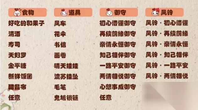注意事项: 1、不同的食物、御守、道具搭配好之后派遣缘结神出去,4小时候归来会带回奖励。 2、正确的搭配会获得更好的奖励,并且带回需要收集的风铃。 3、所需的食物、御守、道具在缘结神社中使用祈愿币可以购买。