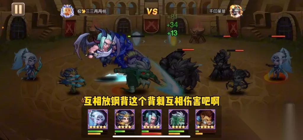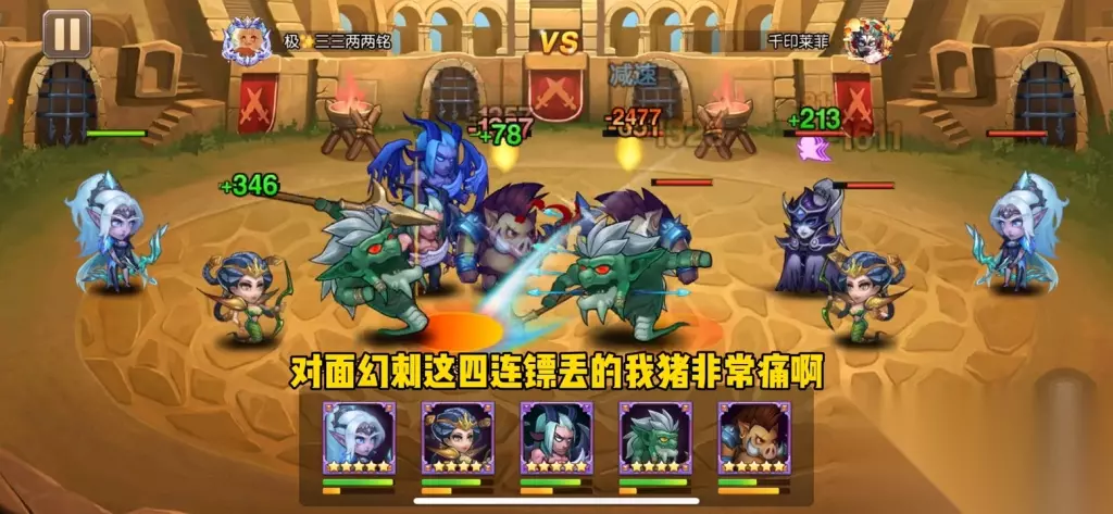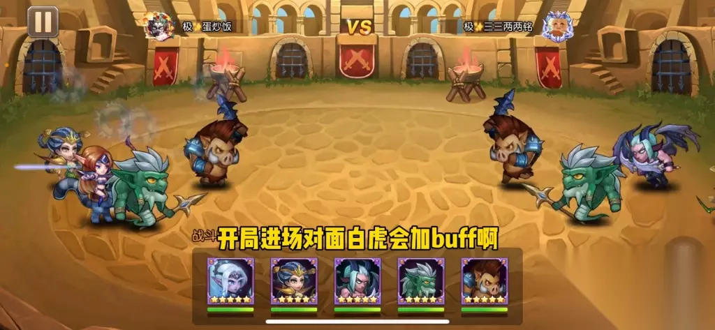 ·再看看竞技场的一场阵容,对面是普通的白虎和小黑的物理速攻队,开局时对面的白虎会加buff,我没有上白虎防守,而是打鱼人互相点灯。因为有白虎buff的加持,对面打我比较痛,我的钢背猪也快要被打死了。 战斗一姐的分裂箭控制能力很强,因为我没有变身,所以没有霸体的功能,直接被秒掉了,这个英雄就没有用了吧?我认为,如果对面不带白虎,灵魂守卫在物理队内战中表现还不错。如果对面带了白虎,可能灵魂守卫还没开大招就被秒掉了,也许要到80级后增加了血量,这个英雄才能用得更好。
