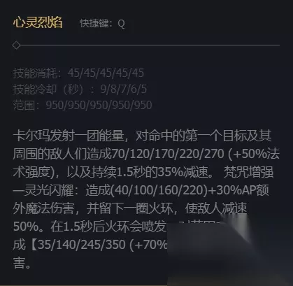 技能介绍 1、卡尔马主Q副E,Q技能是发射一团能量,对命中的敌人及周围敌人造成伤害和减速。