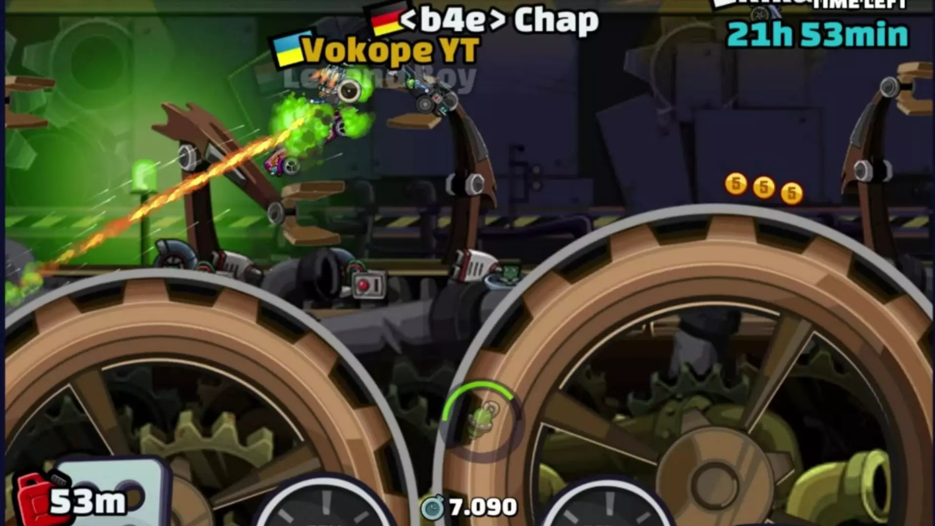 玩家分享赛车游戏《登山赛车2》的游戏经历,在登斯拉史诗宝箱开出落地配件,未开出尾翼,从其他宝箱开出登斯拉金币加速,还达成了荒漠超低配非永动机登斯拉行驶16000+m的成绩。