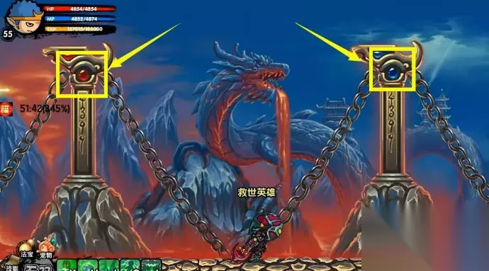 2、进入副本后,跳起来打柱子上的珠子,一共有三个柱子,使其都变成红珠。