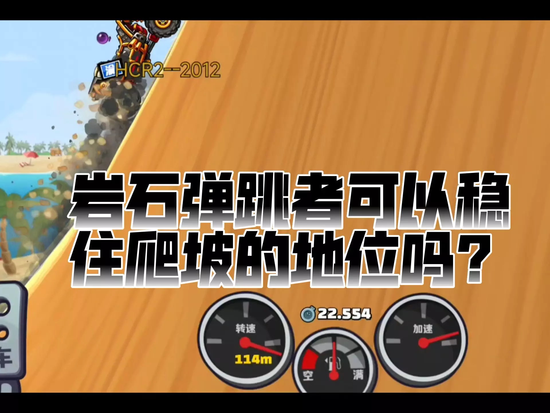 这是必剪创作的《登山赛车2》相关内容,展示了游戏里车库中爬坡能力较强的赛车,在45度500米爬坡测试计时赛中,热棒飞车取得了29.769的个人纪录,呈现了赛车爬坡的游戏过程。