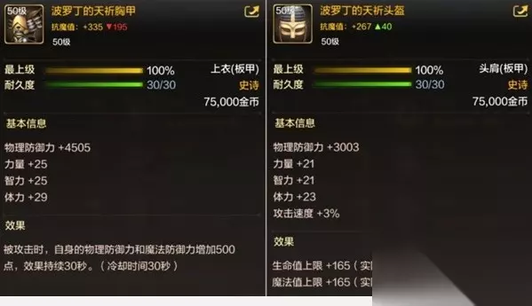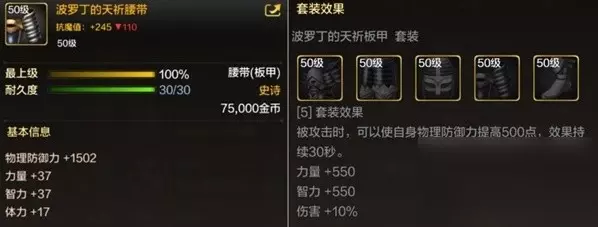 是由胸甲、头盔、绑腿、长靴、腰带等部位组合而成,它们各有各的属性效果。 波罗丁天祈套拥有50级面板之神的称呼,对于追求高输出的玩家很友好。