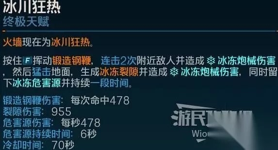 终极天赋:冰川狂热 冰川狂热赋予你强大的铸造钢鞭,可撕裂一切敌人。 该鞭挞能造成重范围伤害并施加强力冰冻效果,冻结目标并创造轻松暴击的机会,同时残留的冰冻危险区域将持续威胁敌人。