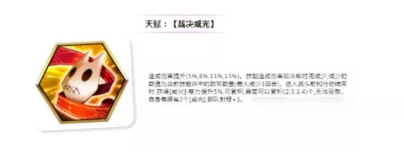 降生之光介绍一览 天赋: 【裁决威光】 造成伤害提升(5%,8%,11%, 15%)。技能造成伤害后冷却时间减少,减少的数值为当前技能命中的敌军数量(最大减少3回合)。进入战斗前和行动结束时,获得[威光]:智力提升5%,可 累积最高可以累积(2,3,3,4)个,无法驱散。自身每拥有2个[威光],部队射程+1。