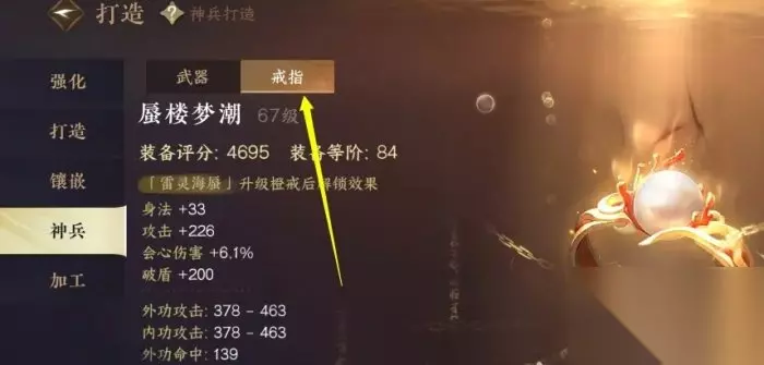 《逆水寒手游》橙戒获取方法详情 获取方法:首先大家在【打造】界面,找到神兵,再点击戒指,