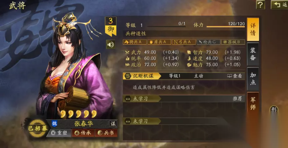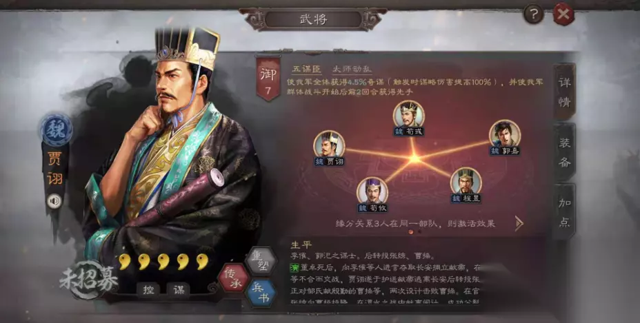 二、战法配置详解 1. 曹操:防御中枢 作为阵容的定海神针,曹操的战法选择直接决定全队生存能力。推荐: 核心战法:抚辑军民+刮骨疗毒 平替方案:御敌屏障+坐守孤城 抚辑军民在前三回合可提供高达40%的群体减伤,配合刮骨疗毒的精准治疗,堪称移动医疗站。兵书选择"援其必攻+励军+掩虚",将辅助效果发挥到极致。 2. 贾诩:控场大师 这位毒士的战术价值在于打乱敌方节奏: 标配战法:夺魂挟魄+杯蛇鬼车 备选方案:兵无常势/四面楚歌/伪书相间 夺魂挟魄的偷属性机制让贾诩越打越硬,杯蛇鬼车则实现控场续航两不误。搭配"以治击乱+妙算+鬼谋"兵书,让混乱效果如附骨之疽般难以摆脱。 3. 程昱:核弹射手 作为阵容的终结点,程昱的配置需要极致输出: 必带组合:太平道法+士别三日 过渡选择:白眉+四面楚歌 太平道法将自带战法发动率提升至质变临界点,士别三日提供的规避效果和智力加成,让程昱化身后排炮台。兵书"奇正相生+执锐+文韬"三件套,将输出能力推向巅峰。