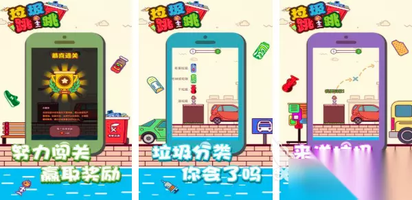 宝宝垃圾回收,一款为小朋友们专门打造的垃圾分类小游戏,不仅从中能够学习到有趣的垃圾分类知识,而且还可以展开温情满满的亲子互动,与爸爸妈妈一起学习正确的垃圾分类,掌握更多垃圾分类的小妙招。在回收垃圾玩法当中,可以通过回收的各种各样的小垃圾,通过一步步加工制作成创意小玩具。 高速下载 普通下载 优先233乐园APP下载 2、《垃圾跳一跳》