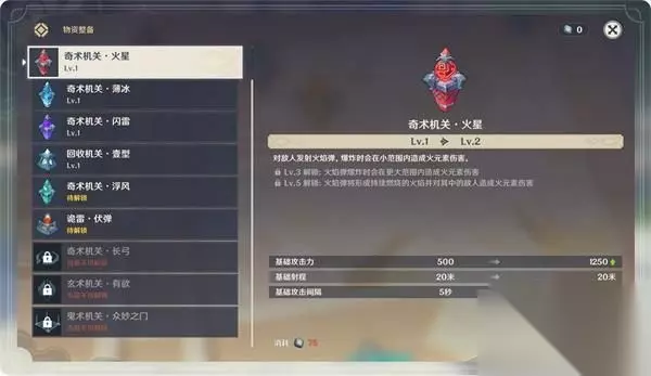 物资整备 在局外的「物资整备」页面中,旅行者们可以消耗「奇术符」来解锁新机关和升级已有机关。 不同种类的奇术机关具有不同的特性。