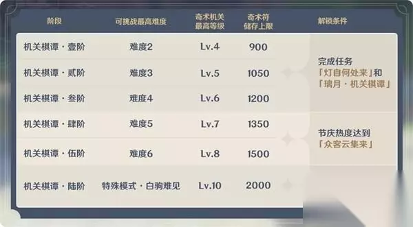 〓开放时间〓 玩法开启时间:2021/02/10 10:00 ~ 2021/02/28 03:59 〓参与条件〓 完成任务「灯自何处来」和「璃月·机关棋谭」后可开启「机关棋谭」挑战。 〓阶段说明〓 「机关棋谭」共分为6个阶段,解锁更高阶段可以解锁棋局对应更高的挑战难度,并提升奇术机关的等级上限和奇术符的储存上限。每个阶段的解锁条件如下: