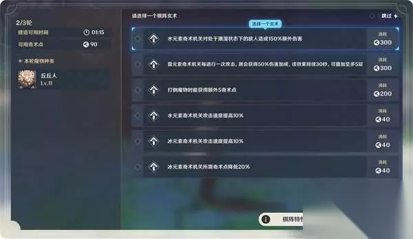 棋阵玄术 每轮挑战的战斗阶段结束之后,旅行者们可以有机会选择棋阵玄术。棋阵玄术可能会带来以下效果: 部分玄术可以使棋手获得额外的奇术点; 部分玄术可以强化机关或增加机关建造上限; 部分玄术会增加下轮挑战的难度,但完成挑战后可以获得额外的奇术符; 部分玄术在给机关带来巨大增强的同时,还会带来可怕的负面效果。 旅行者们在选择时请务必小心谨慎……同时,也可以点击界面右上角的【跳过】按钮,直接跳过玄术的选择。