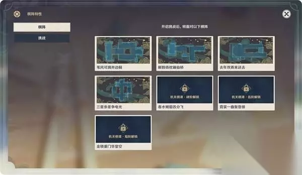 *机关的等级越高,升级需要消耗的奇术符越多。 棋阵 解锁「机关棋谭」玩法后,旅行者们将面对以下棋阵,随着「节庆热度」达到不同阶段,旅行者们可解锁更多的棋阵。