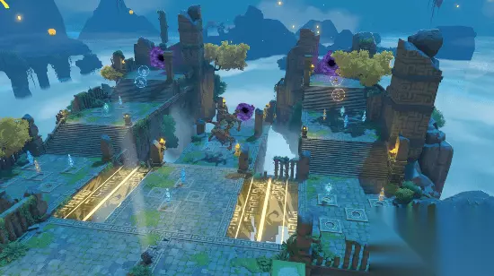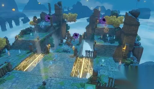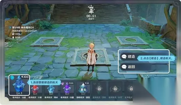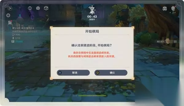 棋局开启后,角色会进入棋阵中。每局棋局分为若干轮挑战,每轮挑战包含建造阶段和战斗阶段。 在建造阶段,界面上方会开启倒计时,旅行者们可以利用这段时间来规划战术,建造机关。此时本轮魔物的行进路线会在地面上预先指示。 旅行者们可以在指定基座位置建造各类奇术机关,利用机关对魔物们造成伤害。